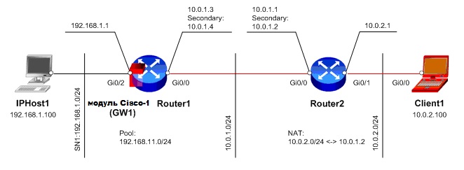 Следующий сценарий иллюстрирует построение защищенного соединения между подсетью SN1, защищаемой шлюзом безопасности в виде модуля Cisco, и мобильным клиентом С-Терра Клиент (Рисунок 6). Для защиты будет построен VPN туннель между устройствами модуль Cisco-1 и Client1. Устройство Client1 сможет общаться по защищенному каналу (VPN) с устройствами из подсети SN1 (в частности с IPHost1). Адрес мобильного клиента неизвестен заранее – клиент находится за динамическим NAT-ом. Маршрутизатор Router1 будет настроен статически NAT-ировать внутренний адрес модуля Cisco в свой внешний secondary-адрес.
