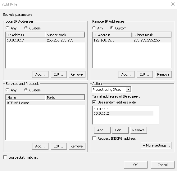 Создание и редактирование правила производится в окне Add/Edit Rule, которое вызывается кнопкой Add или Edit во вкладке IPsec Rules: