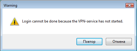 Окно логина в Продукт (Рисунок 31) будет выводиться только при запущенном VPN-сервисе. Если к моменту вывода окна OC Windows еще не запустила VPN-сервис, то Продукт будет ждать 30 секунд (по умолчанию). Если VPN-сервис не будет запущен и через 30 секунд, то появится сообщение с предложением повторить процесс логина (Рисунок 33). Чтобы данное окно не появлялось – увеличьте время инициализации сервиса (см. раздел. «Время инициализации VPN сервиса»).