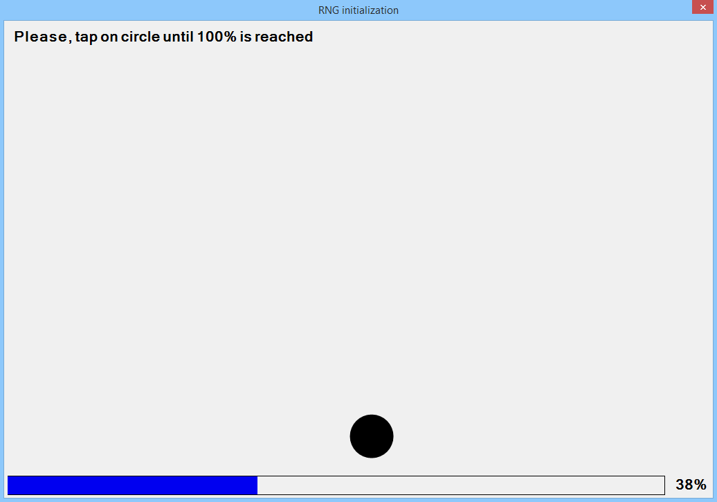 Предлагается «биологическая» инициализация ДСЧ – нужно нажимать запрашиваемые клавиши либо нажимать на круг, меняющий свое местоположение на экране (зависит от настроек, заданных при подготовке инсталляционного пакета). Если используется режим защиты КС2, то это окно не появится.