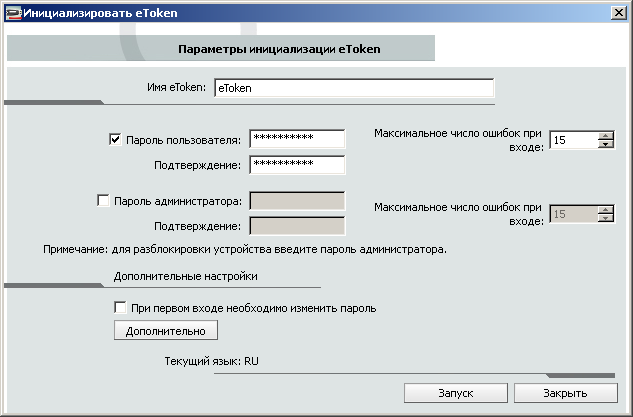 При инициализации токенов eToken PRO и JaCarta не устанавливайте в разделе дополнительных настроек инициализации флажок «При первом входе необходимо изменить пароль»/«Пользователь должен сменить PIN-код» (Рисунок 8).