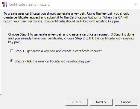 Полученный сертификат пользователя из Центра сертификации надо записать на токен в контейнер с ключевой парой. В окне Certificate creation wizard поставьте переключатель в положение Step 2 (Рисунок 95) и нажмите Next.