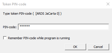 Для записи сертификата в контейнер на токене укажите PIN-код к токену (Рисунок 97). Если установить флажок Remember PIN-code while program is running, то PIN-код запомнится на время работы администратора с программой S-Terra Client AdminTool.