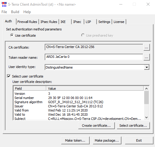 После этого во вкладке Auth появится сертификат пользователя, записанный на токене (Рисунок 98).