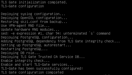 После запуска сервиса С-Терра TLS Шлюз на экране появится сообщение TLS-Gate has been successfully configured! TLS Gate configuration completed об успешном выполнении процесса конфигурации С-Терра TLS Шлюз.