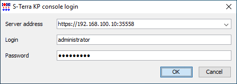 Для подключения к «С-Терра КП» с компьютера администратора используйте удаленную консоль «С-Терра КП». Запустите удаленную консоль, щелкнув по ярлыку S-Terra KP console. Чтобы попасть в главное окно консоли «С-Терра КП» введите имя пользователя и пароль, после чего нажмите кнопку «OK» (см. Рисунок 2).