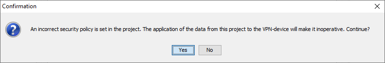 Откроется окно ‘Confirmation’ (см. Рисунок 18), в котором нужно будет сделать выбор, использовать ли для редактирования существующую VPN конфигурацию, полученную с устройства Client1, или же начать конфигурацию заново. Нажмите «Yes» чтобы редактировать существующую конфигурацию, или выберите «No», чтобы начать конфигурацию с чистого листа.