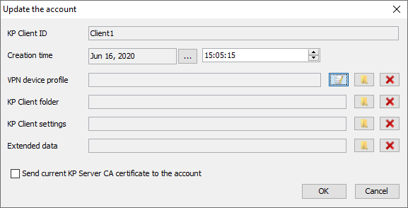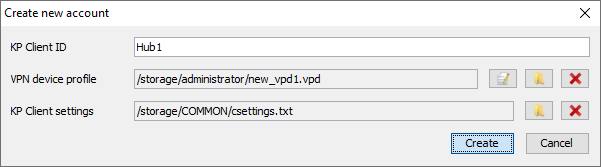 1. В главном окне консоли «С-Терра КП» в меню выберите пункт Accounts -> Create. В открывшемся окне в поле KP Client ID введите название для учетной записи и нажмите кнопку создания нового VPN профиля (см. Рисунок 3).