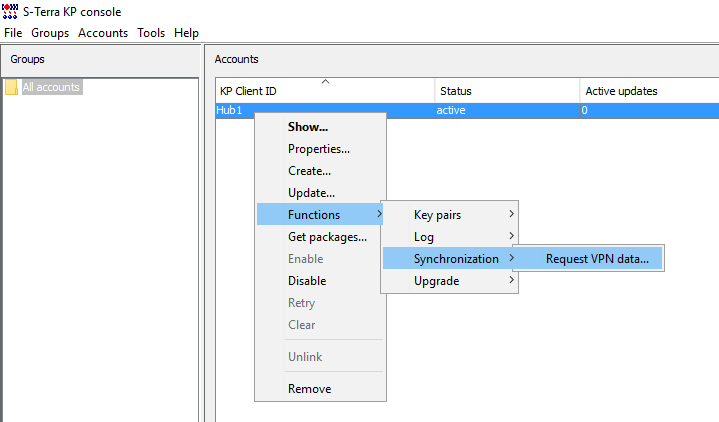 1. Синхронизируйте VPN конфигурацию криптошлюза Hub1. Для этого в контекстном меню учетной записи Hub1 выберите пункт Functions -> Synchronization -> Request VPN data (см. Рисунок 12).