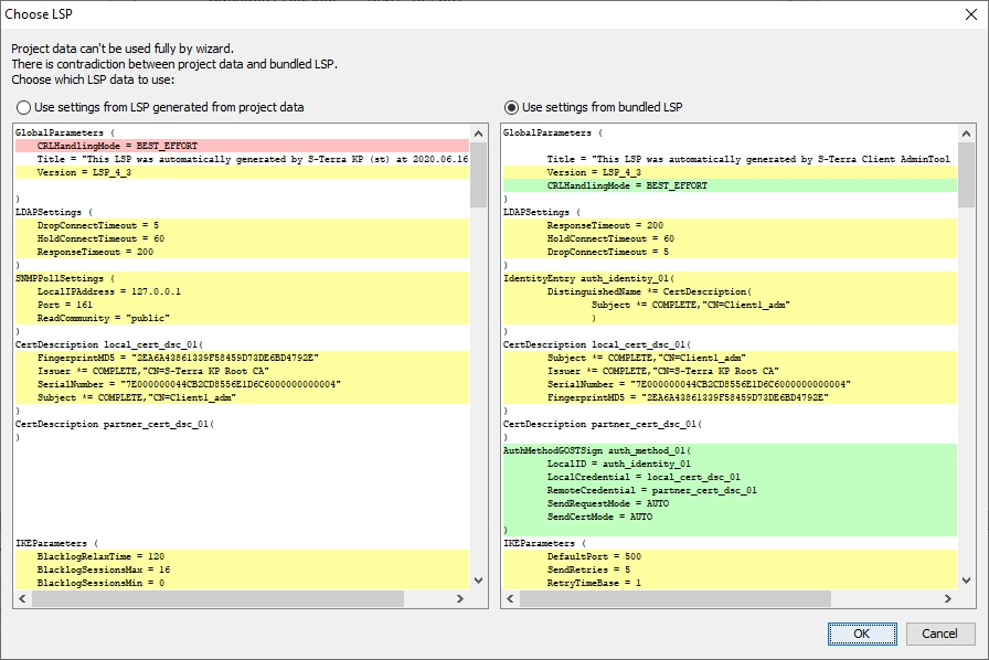 Если выбрать редактирование существующей VPN конфигурации и в окне ‘VPN data maker’ запустить мастер настройки по кнопке «Run Wizard», то будет показано еще одно окно с предупреждением о расхождении между конфигурацией LSP, полученной с клиента, и LSP, которая была автоматически сгенерирована при создании учетной записи Client1 (см. Рисунок 19).