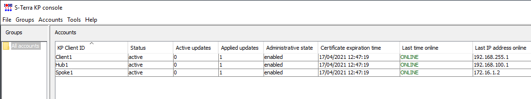 После выполнения всех действий по подключению устройств Hub1, Spoke1 и Client1 к КП, они все должны отображаться в главном окне «С-Терра КП», иметь по одному примененному обновлению и находиться в статусе ONLINE (см. Рисунок 20).