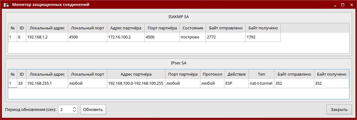Так как в сценарии используется механизм IKECFG, туннель на момент проверки уже автоматически построен. Он строится сразу после аутентификации в «С-Терра Клиент А». Убедиться в этом можно на устройстве Client1 в окне Показать данные SA... ПО «С-Терра Клиент А» (см. рисунок 36 и рисунок 37):